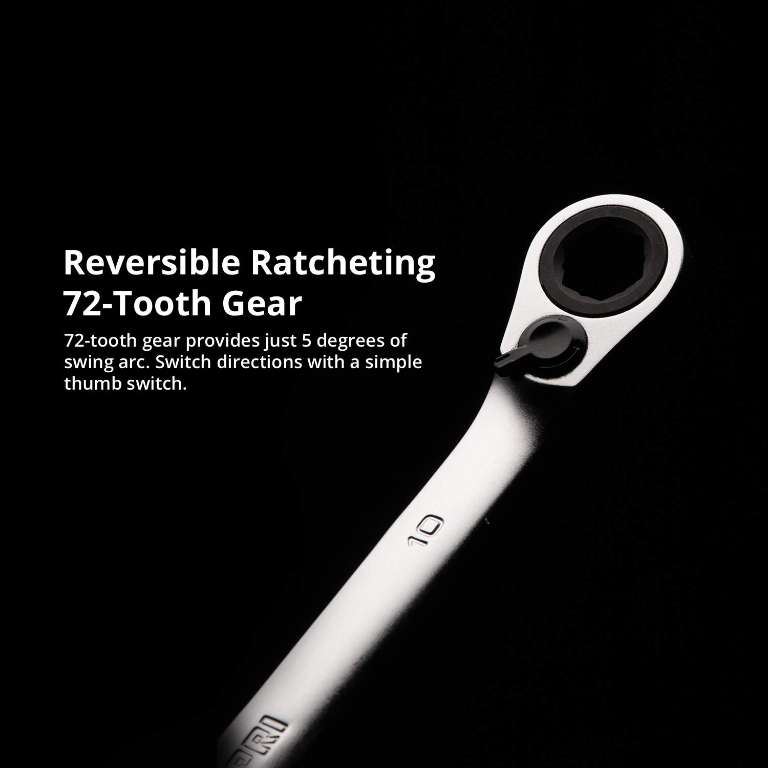 - Reversible single-pawl 72-tooth ratchet gear with just 5 degrees of swing arc, switchable with a simple thumb switch. Long pattern wrench length, up to 20% longer than standard, gives you more leverage and turning power
