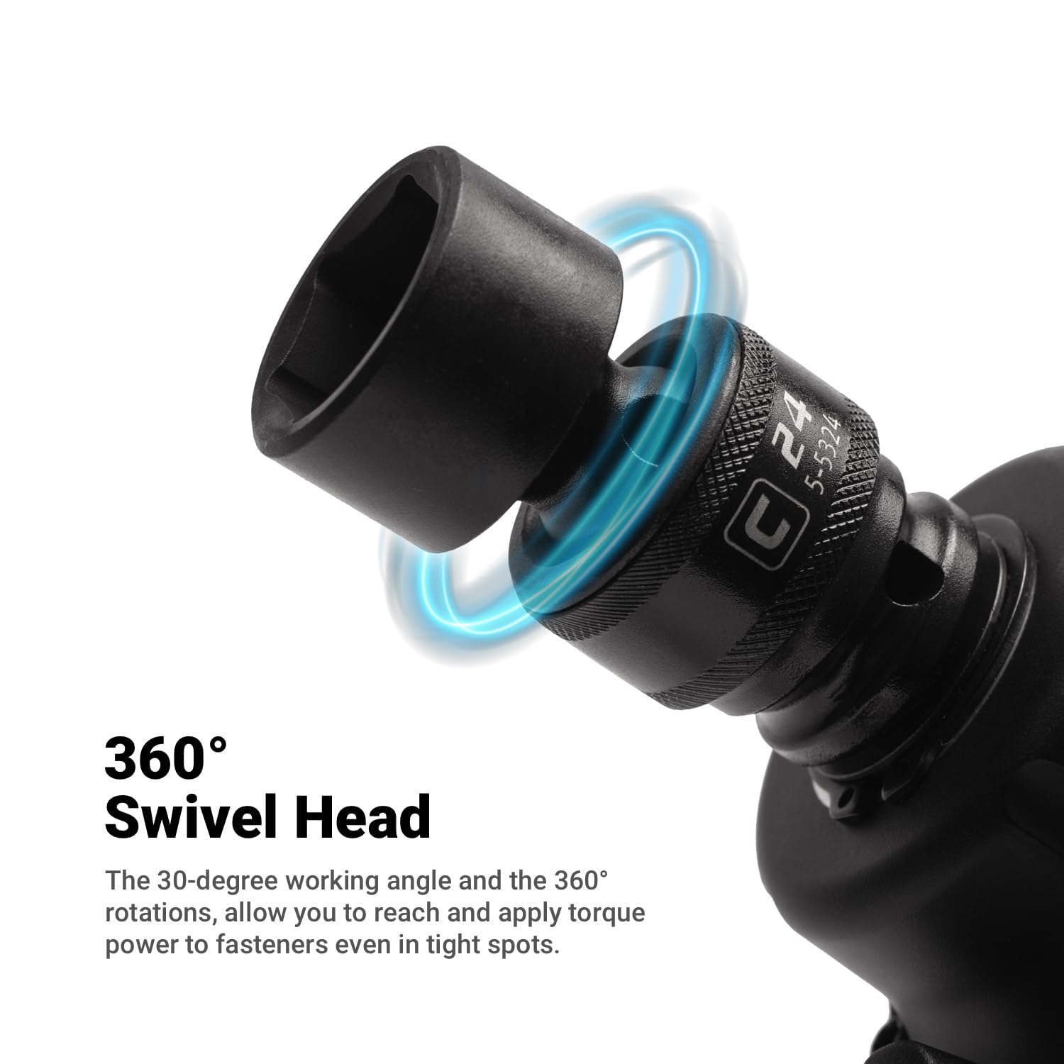 - The universal swivel impact socket has a 30 degree working angle and rotates 360 degrees, letting you reach and apply torque power to fasteners even in tight spots